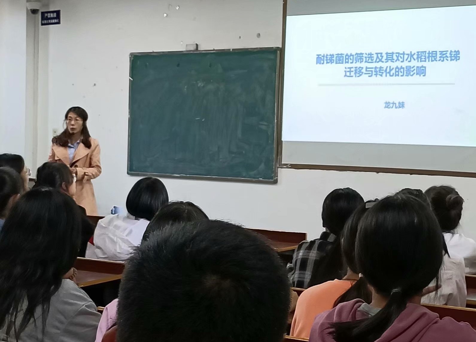 龙九妹博士首先介绍了自己的研究课题——耐锑菌的筛选及其对水稻根系锑的迁移与转化的影响以及重金属锑的基本特点与性质。