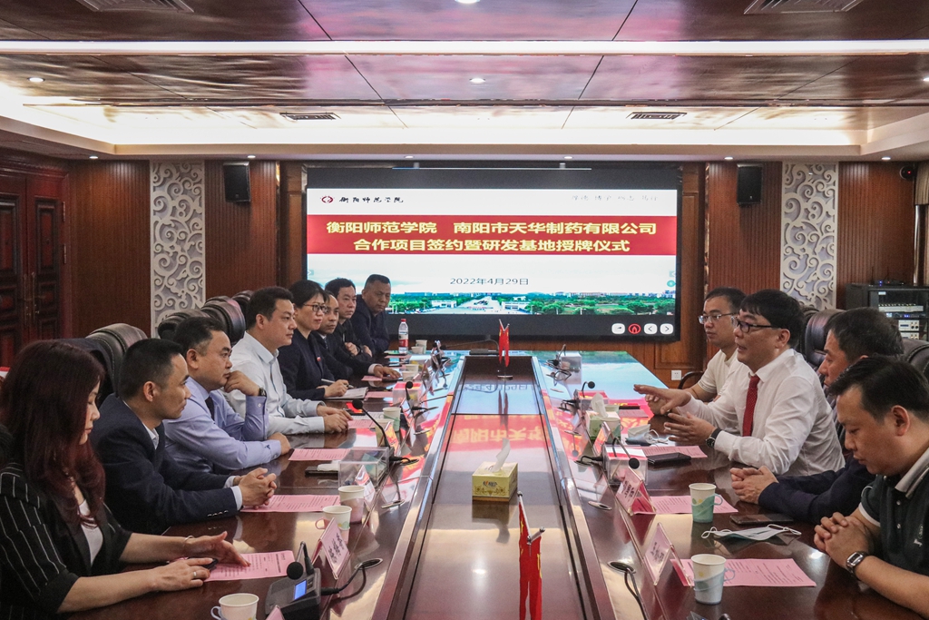 4月29日上午,betway西汉姆联官网与南阳市天华制药有限公司合作项目签约暨研发基地授牌仪式在办公楼二会议室举行。校长皮修平、南阳市天华制药有限公司董事长王峰、副总裁孙国印等一行四人出席会议,副校长魏晓林主持会议。
