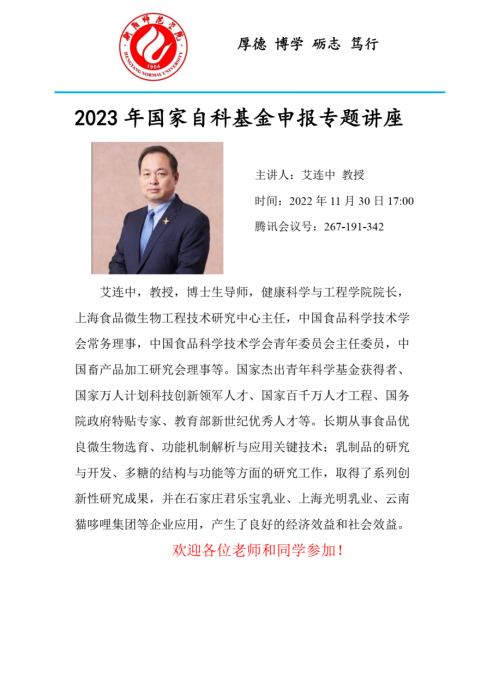 上海理工大学健康科学与工程学院院长艾连中教授于2022年11月30日17:00通过腾讯会议的网络平台对betway西汉姆联官网教师进行了国家自科基金申报专题讲座。艾教授以国自科申报的指导思想,评审的关键点,以及标书撰写注意事项为大家做一场精彩的国自科申报讲座,会上生科学院教师进行热烈讨论。
