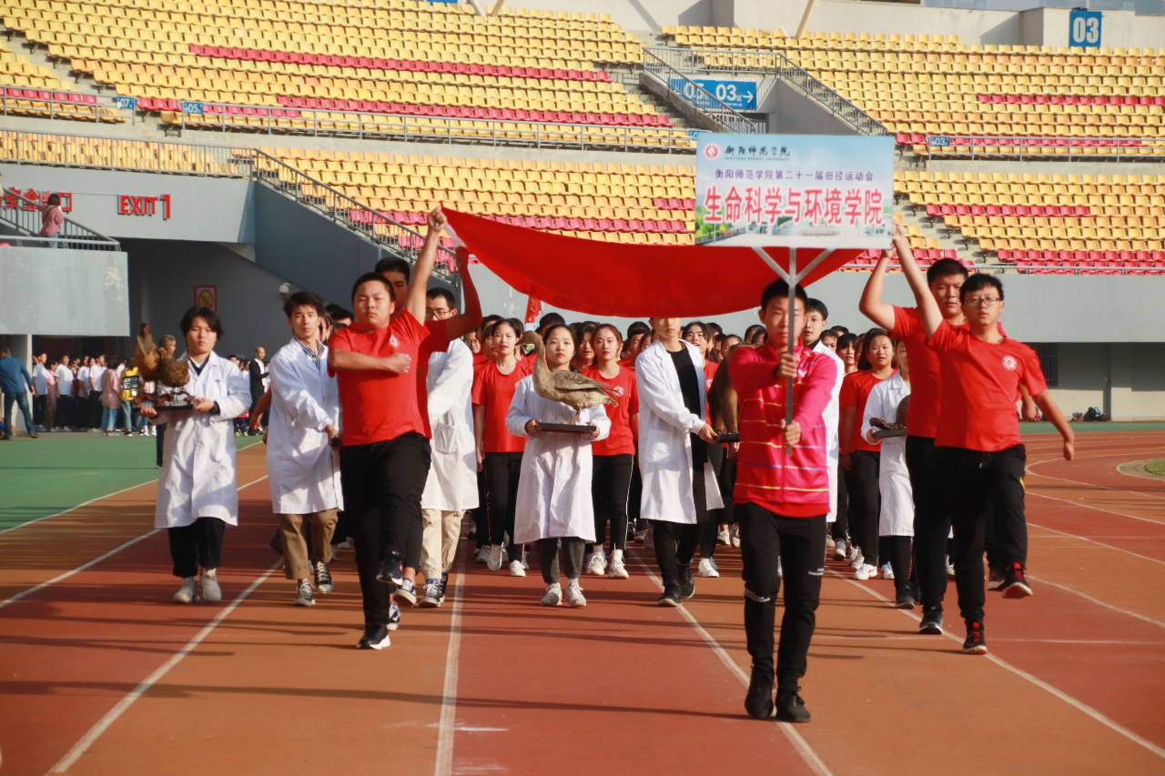 上午八时三十分,伴着激昂的进行曲,国旗方队、校旗方队、裁判员方队、学校23个分工会方阵队等依次出场。观众席上不时响起为各个方阵鼓掌加油的声音。朝气蓬勃的队员们在运动场上踏着整齐的步伐迈入操场。betway官网方阵队身着红黑二色服装迈着整齐划一的步伐,在运动场上激扬喊出“攻无不克,战无不胜,生环学子,更上层楼”的口号,用青春点燃生命之火,用热血绽放环境之光。在院旗队伍后面,几名学生身着白色实验服托举着棕熊、狼、穿山甲等珍贵动物标本从主席台前走过,一个个标本展示着生环学院探索生物奥秘的神奇力量。