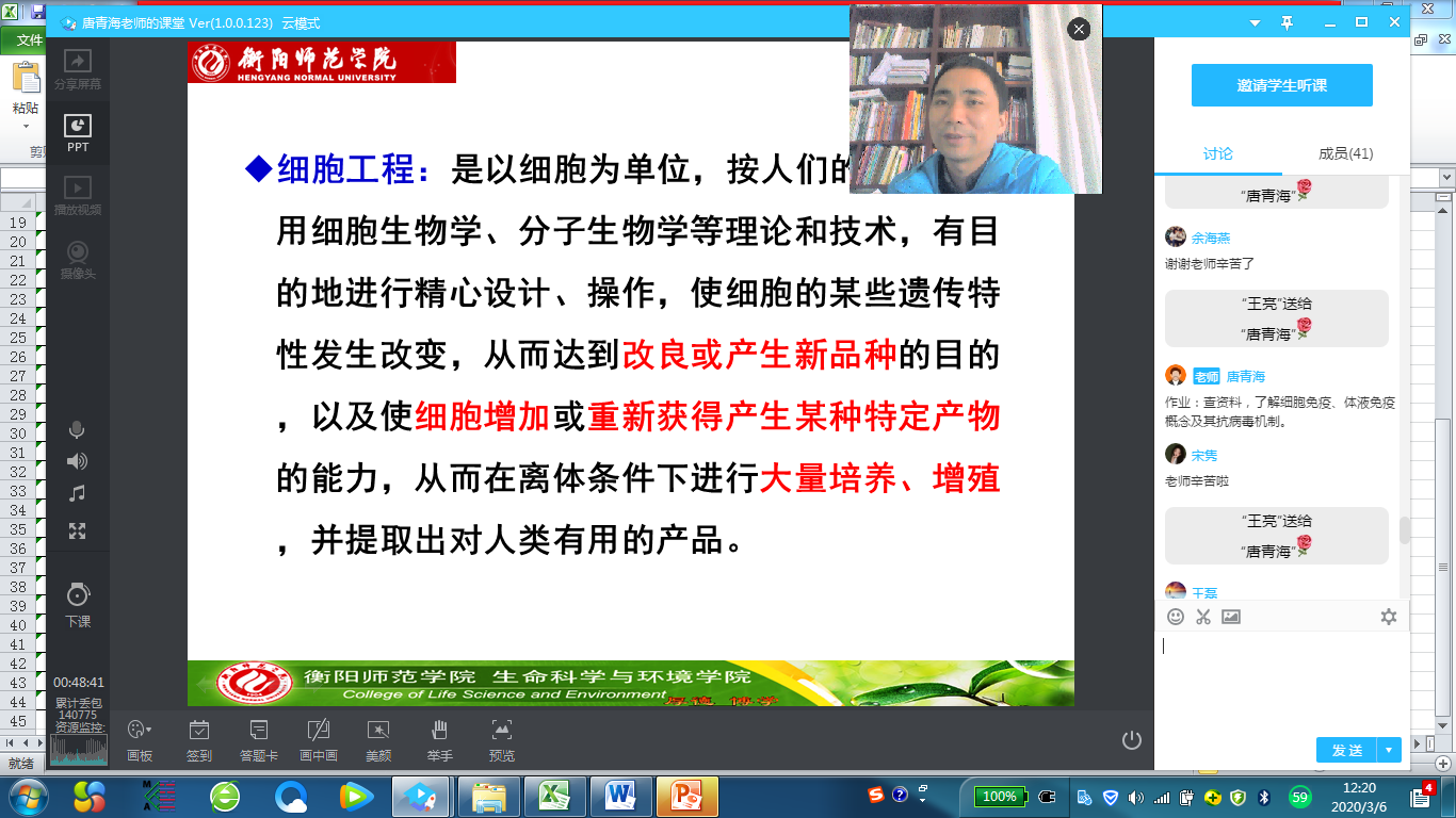 做直播同样需要备课,准备ppt。直播过程软件有讨论区,每个同学有问题可以及时在讨论区留言,教师可以及时回复,同样教师也可提问,学生在讨论区回答。直播课程可以很好的互动、师生沟通直接。重要的是,直播课程可以根据需要、调整授课内容的重点、更新前沿进展,这是一般现成的网络课程无法做到的。再者,所有完成的直播课程,软件都会在24小时内生成回放视频,某些因特殊情况不能及时上课的、有需要再复习的同学可以随时进行回放观看。直播课程中,以腾讯直播课堂软件为例,学生能看到教室、以及ppt,但教师却看不到学生,只能在签到区看到到课的学生姓名,不能一对多进行视频,这是一大缺憾。此外,由于是网络直播,且可以回放,几乎是全开放式环境,各种表达可能都要更为谨慎。网络直播也需要安静的环境,这段时间我是一个人在家,无形中为直播课程提供了安静的环境,有些教师在家里可能难以保障“安静”的环境,这一点,做直播课的老师需要考虑。