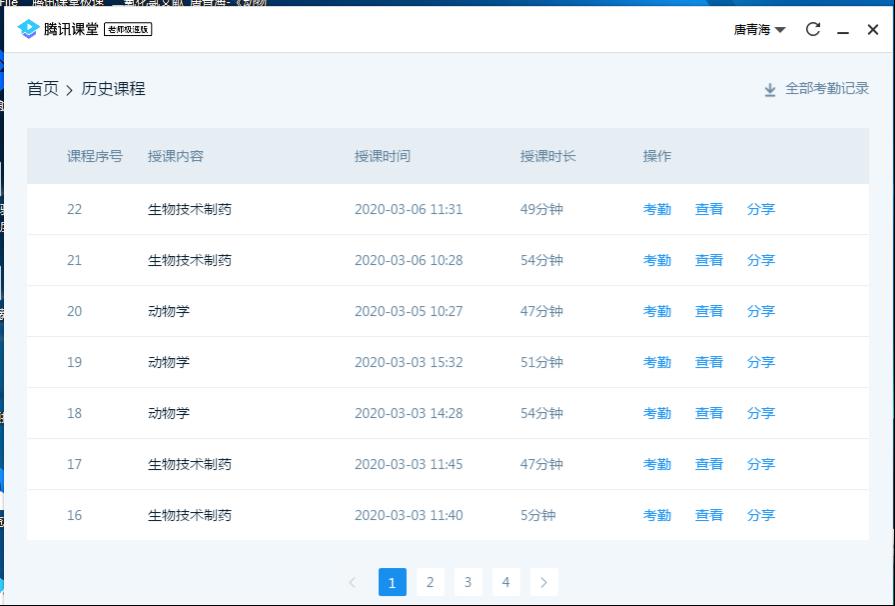 腾讯课堂软件客户端历史课程界面(含考勤、回放、分享功能)