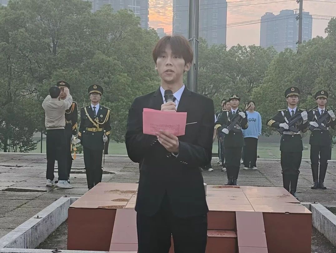 奏唱国歌结束后,由23级环境专业彭震同学带来国旗下的讲话。彭震同学以介绍党的故事为契机,倡导同学们积极投身到党的事业中来,为实现中华民族伟大复兴的中国梦贡献自己的力量。他向我们讲述了党发展历程中的初心与使命,带我们领略了党领导人民进行改革开放和社会主义现代化建设所取得的历史性成就,让我们学习了初心和使命并不是空洞的口号,必须要具体落实到行动上。“时刻牢记党的初心和使命,不断为人民谋幸福、为民族谋复兴。让我们以更加昂扬的斗志、更加务实的作风,为实现中华民族伟大复兴的中国梦而努力奋斗”不仅是国家对青年的期望,更是时代对青年的要求。