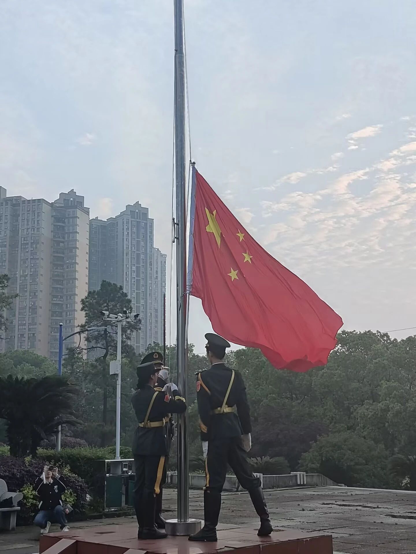 时钟指向六点半,略带凉意的晨风、整齐的脚步、嘹亮的口号无一不彰显着教导队成员的气宇非凡与升旗仪式的威严肃穆。随着雄伟的国歌奏响,旗手精神抖擞地走到旗杆前,将五星红旗扬起、绽开、升起。在庄严的国歌声中,同学们纷纷向国旗行注目礼,表达了对祖国的热爱与敬意。