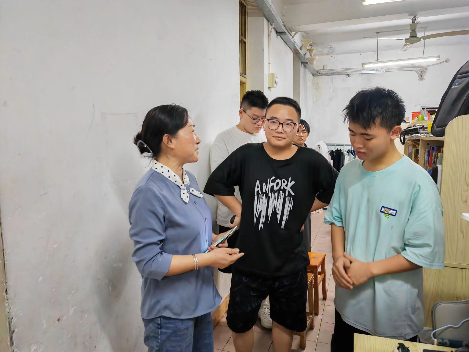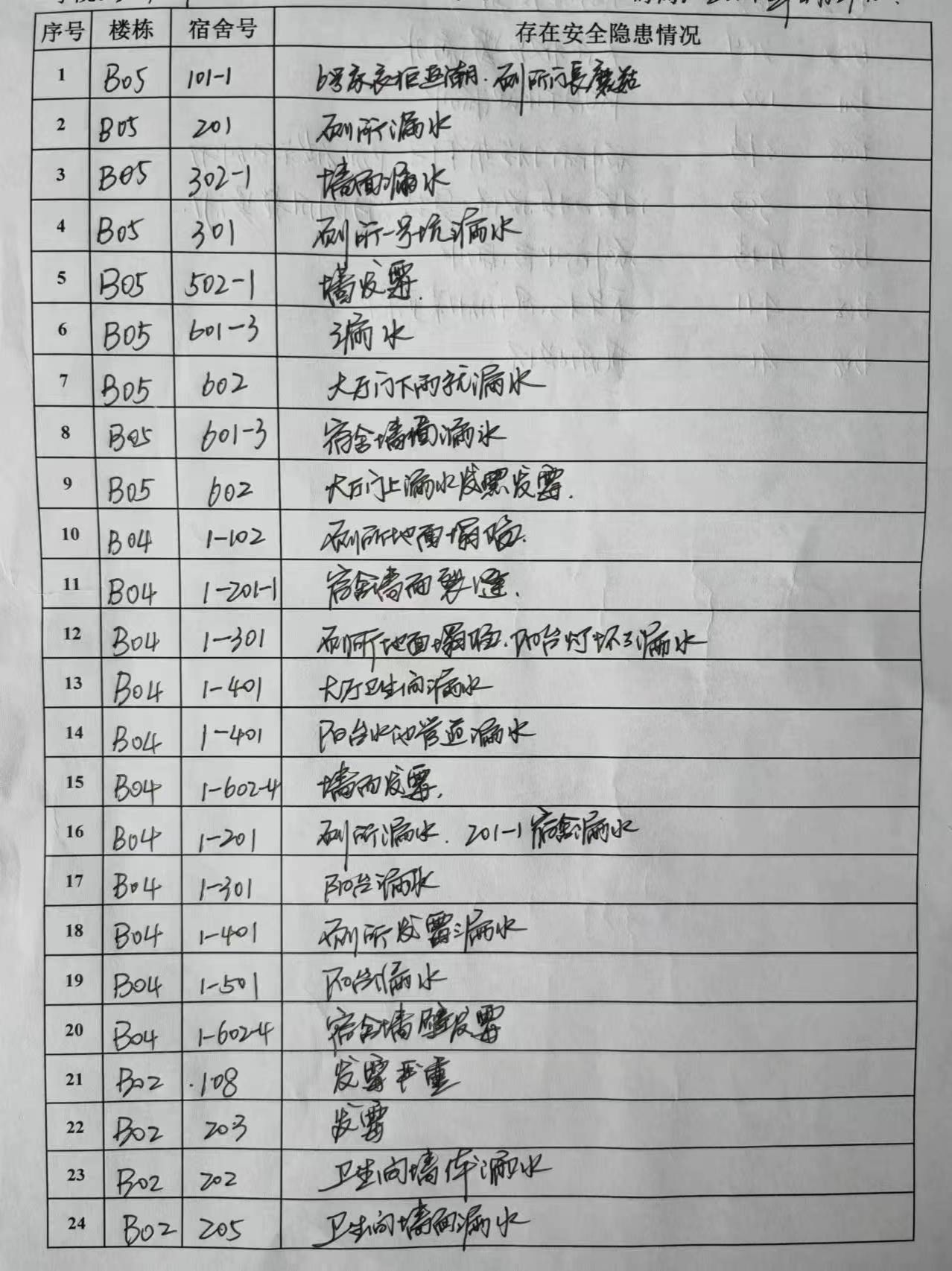 为确保排查工作深入细致,学院采取每个宿舍过一遍,每个房间查一遍的形式,拉网式排查。每到一个宿舍,深入每个房间,查看每个角落,询问每名学生,看是否存在安全隐患,是否有不安全的苗头,是否存在困难问题,并结合当前发生的安全事故,对学生进行随机安全教育,普及安全常识。特别是对用电安全、消防安全等做出强调。同时,对排查过程中存在安全问题详细记录,并明确整改时限。对排查中发现的私自移动书桌衣柜限本周内回归到位,对存在卫生间阳台管道漏雨、厕所门栓不稳固、风扇损坏、灯管不亮等问题及时报修,对墙体发霉、地面返潮、衣柜床板潮湿等问题提醒同学们及时晾晒衣被,宿舍保持通风透气,保持宿舍卫生。