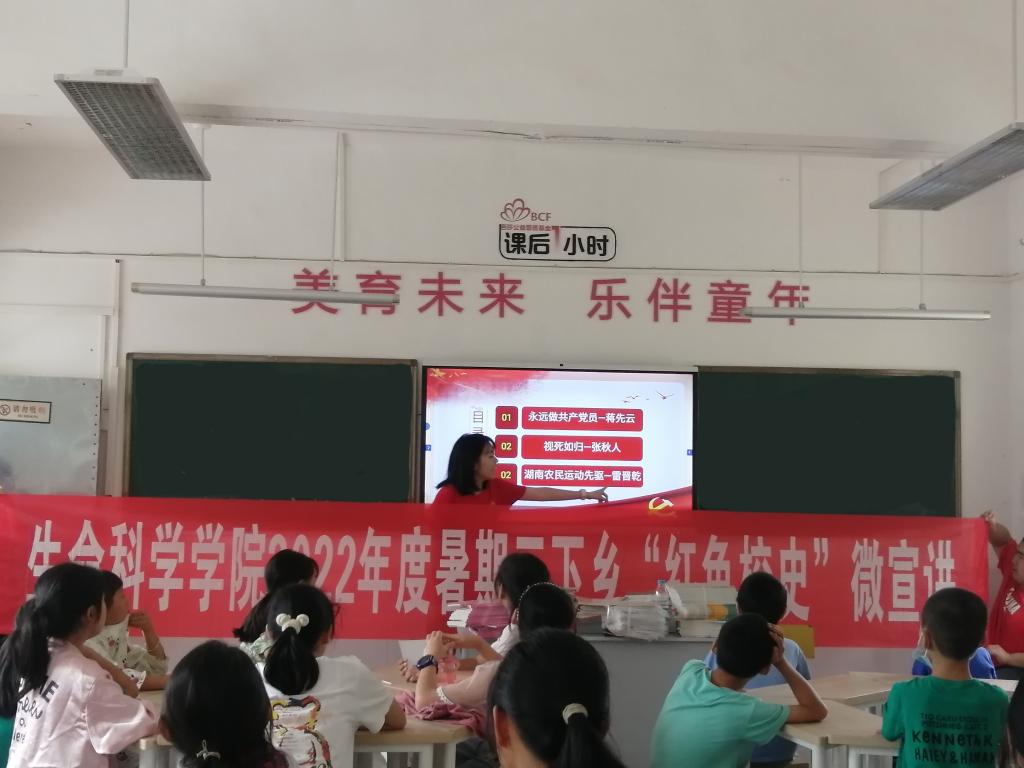 学生是祖国的未来和希望,对他们开展党史、国史教育,用中国共产党和中华人民共和国的光辉历史去教育、培养青少年一代,使他们能够继承革命传统,发扬优良作风。因此,生科学院实践团的志愿者们有针对性地开展了微党课宣讲,带领同学们了解红色革命人物的故事,其中有“永远做共产党人”的蒋先云、“视死如归”的张秋人和“湖南农民运动先驱”雷晋乾。通过带领同学们了解三位红色人物,带领大家了解先烈们身上的故事,让同学们能够从中获得触动,有感而发,努力学习,报效祖国,在同学们的心里种下爱国爱党的种子。