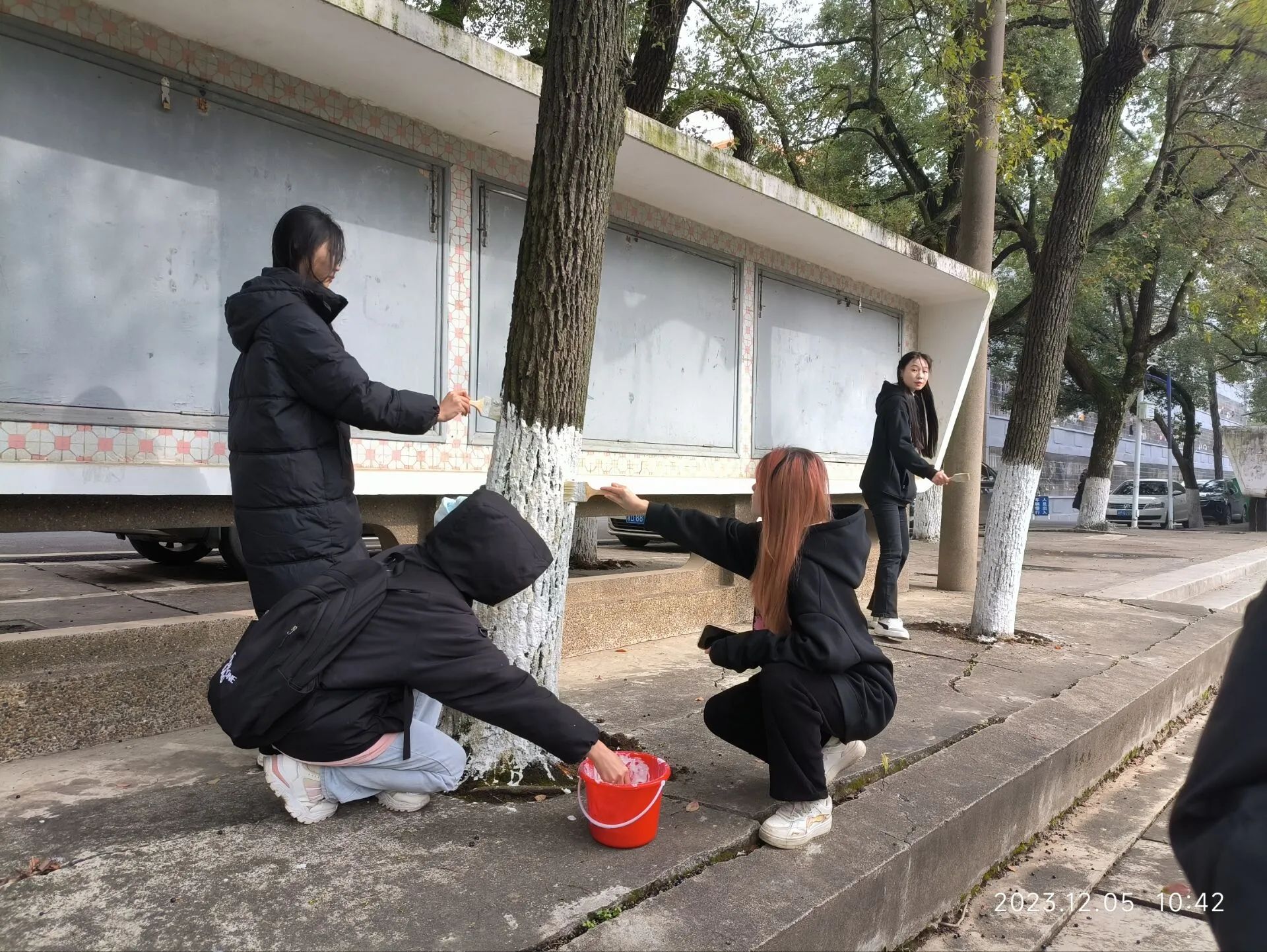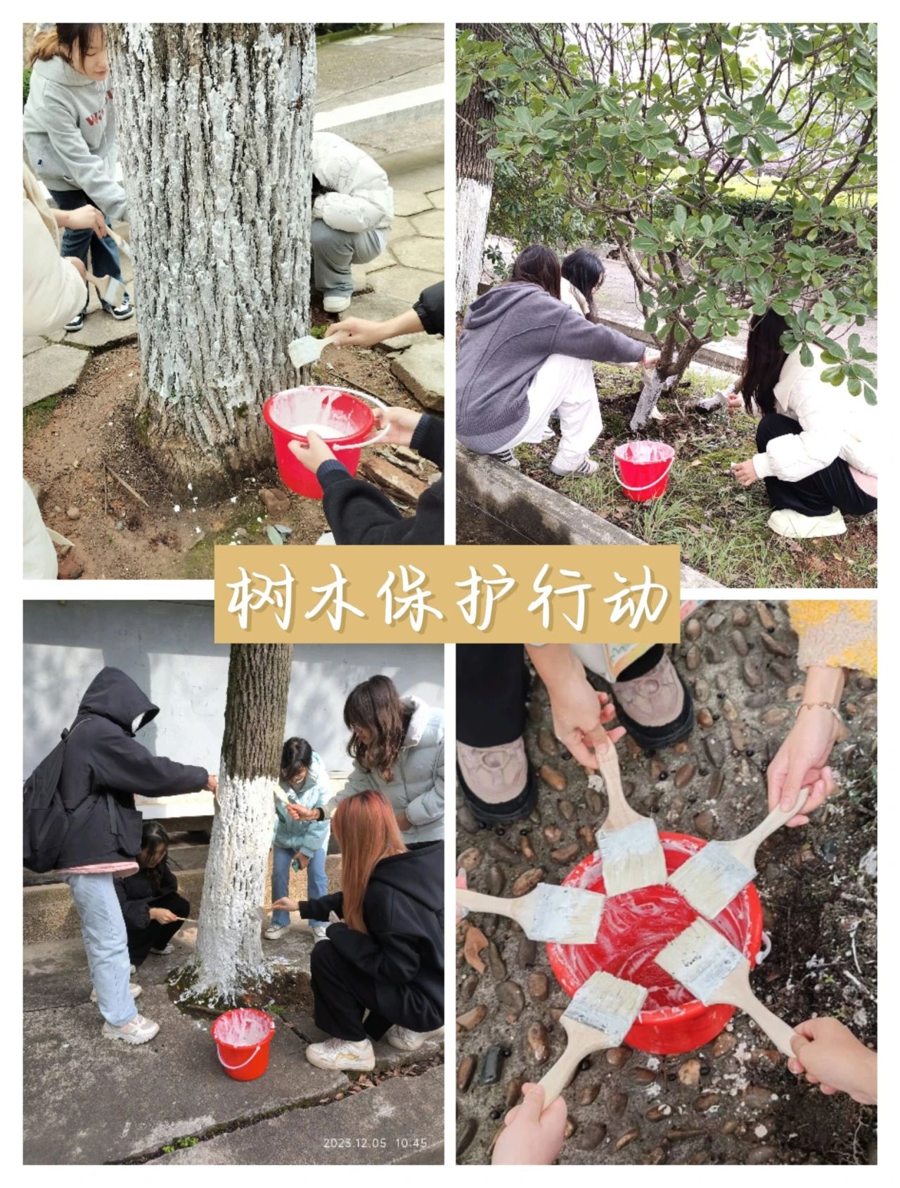 活动内容:志愿者们为betway西汉姆联官网西校区校园内的树木涂抹石灰水,为其防虫、保暖。