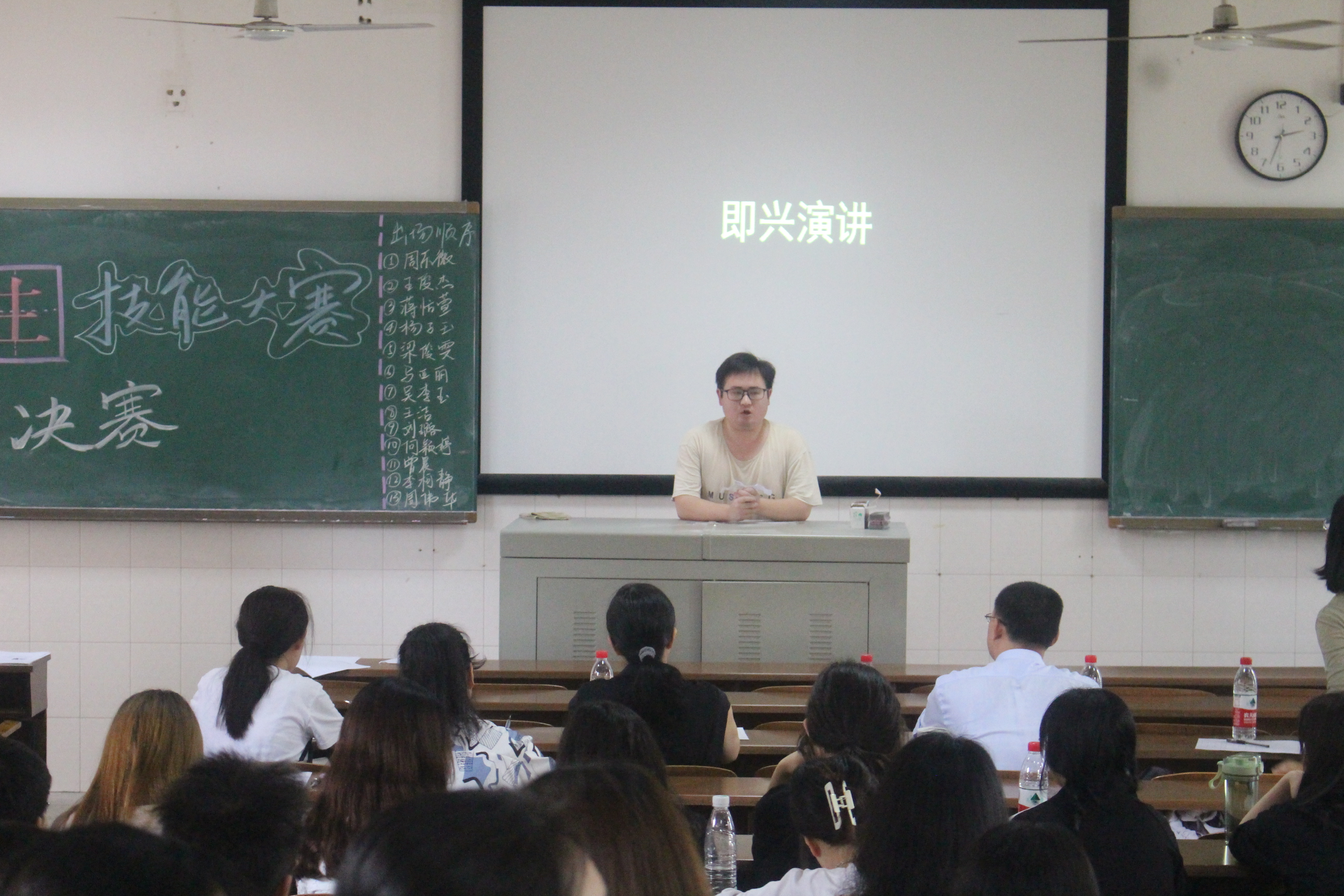 本次师范生技能大赛共分为两个阶段,第一阶段,5月7日晚参赛选手们集中进行决赛的前期准备,第二阶段共分为四个环节,分别是:教育问答,即兴演讲,才艺展示,片段教学四个部分。