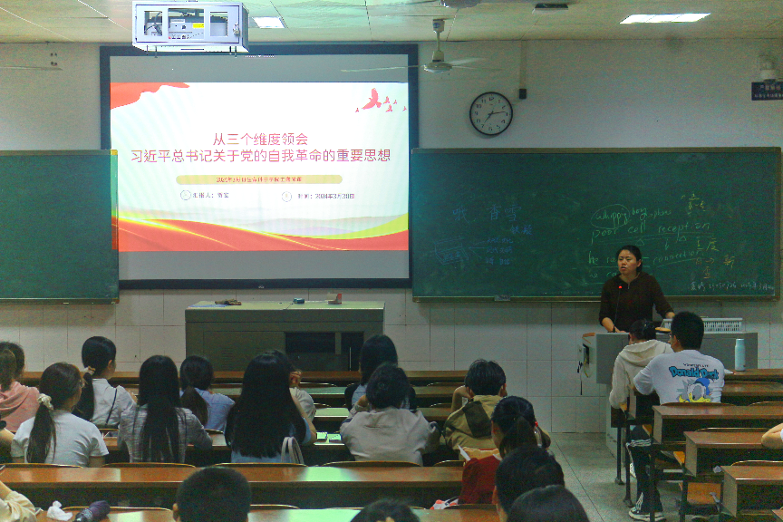 为深入学习贯彻习近平总书记关于党的自我革命的重要思想,提高betway官网学生党员的思想觉悟,充分发挥党员的先锋模范作用,2024年3月30日晚,betway官网学生党支部在行知楼201开展了“从三个维度领会习近平总书记关于党的自我革命的重要思想”的主题党课学习,贺宏同志为本次党课宣讲人,学生党支部书记付蓉和betway西汉姆联官网全体党员同志参加。