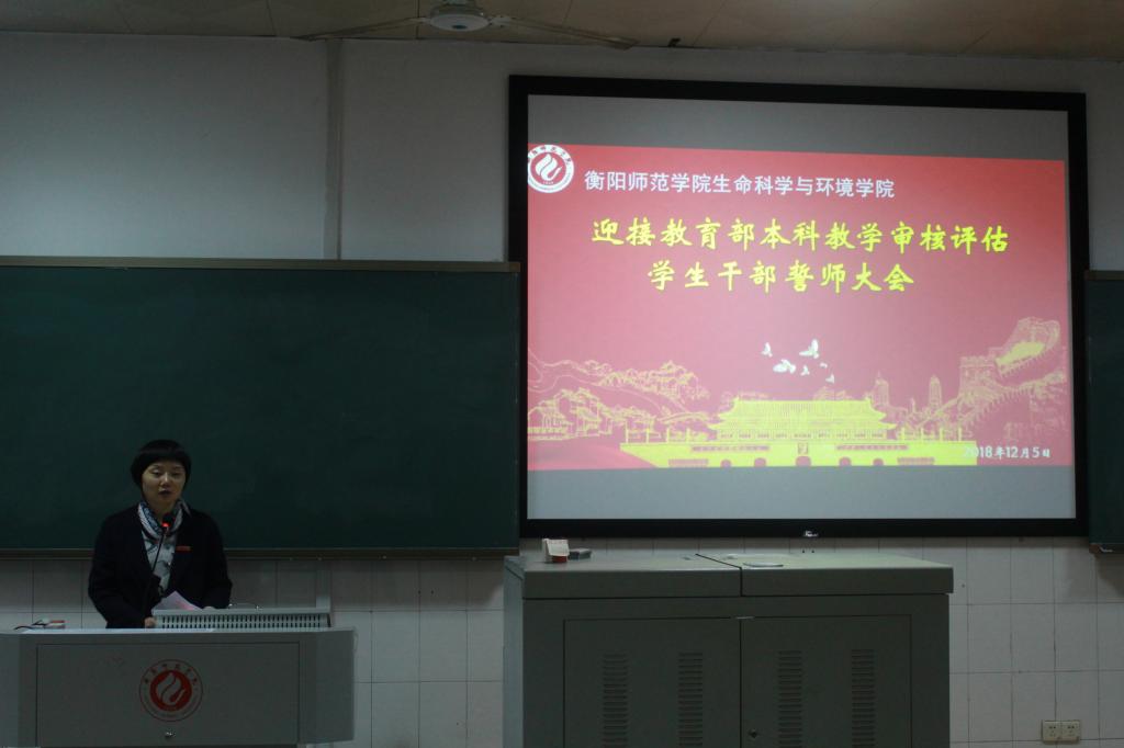 首先,由刘艳波书记为学生干部迎接评估工作布局作出总指示。他指出审核评估是与我们每个人息息相关,紧密相连的工作,在12月10日-13日我们将迎来正式的为期四天的审核评估,到了“争光争气争成绩”的紧要关头,做好这项工作是生环学子义不容辞的责任,人人应有参与评估的紧迫感与责任感。尤其是在座的学生干部——生环院学生的脊梁,理应起带头模范作用,起表率作用,传播积极向上的精神,带领同学们在评估专家面前,展现出衡师人积极的精神风貌。