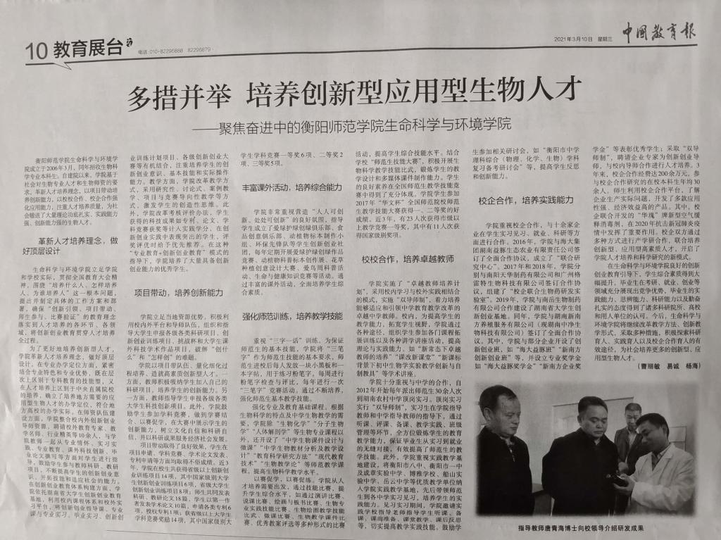 在生命科学与环境学院良好的创新创业教育引导下,学生综合素质得到大幅提升,毕业生在考研、就业、创业等领域充分展现出竞争优势,毕业生的实践能力、思辨能力、科研能力以及勤奋扎实的态度得到了诸多科研院所、高校和用人单位的认可。今后,生命科学与环境学院将继续改革教学方法、创新教学形式,采取多种措施,积极探索科研育人、实践育人以及校企合作育人的有效途径,为社会培养更多的创新型、应用型生物人才。