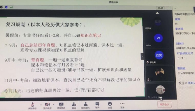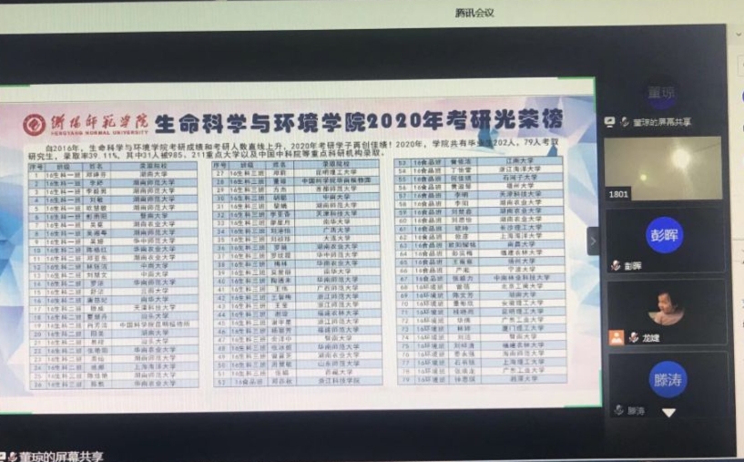 6月15号下午三点,生环学院在腾讯会议APP上顺利举行线上考研交流会。校学工处处长蒋杰,学院党总支书记彭晖,院长曹丽敏,党总支副书记蒋湘祁,副院长杨海、易诚,团委书记刘树芬以及各专业老师莅临本次交流会。董琼、舒洁、阳美等6位同学作为优秀考研学生代表分享自己的考研经验,为17级有意向参加考研的学生答疑解惑。